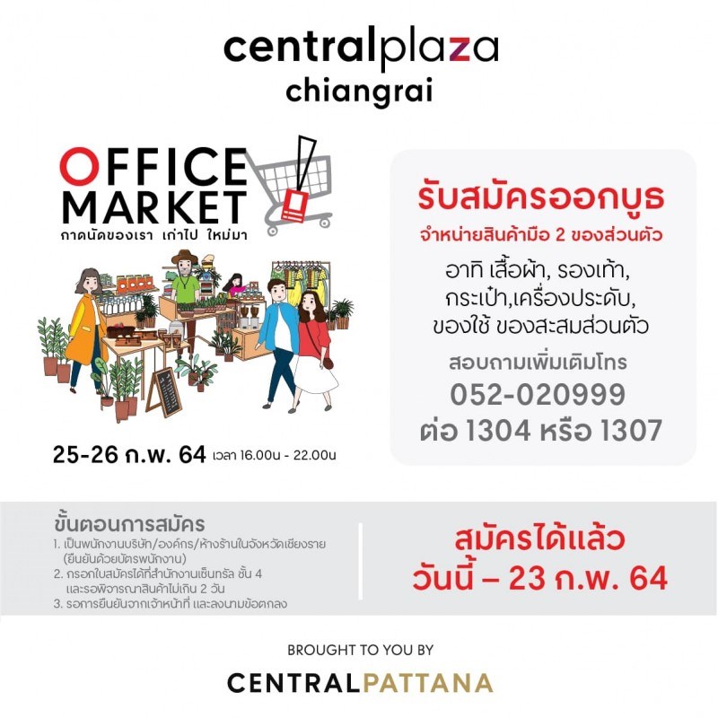 Office Market กาดของเรา เก่าไป ใหม่มา วันที่ 25 - 26 กุมภาพันธ์ 2564 เวลา 16.00 - 22.00 น. ณ ลานกาสะลอง เซ็นทรัลเชียงราย พบกับการออกบูธขายสินค้ามือ 2 สำหรับพนักงานบริษัท/องค์กร/หนักงานห้างร้านในเชียงราย เช่น เสื้อผ้า, กระเป๋า, รองเท้า, เครื่องประดับ, ของสะสมส่วนตัว