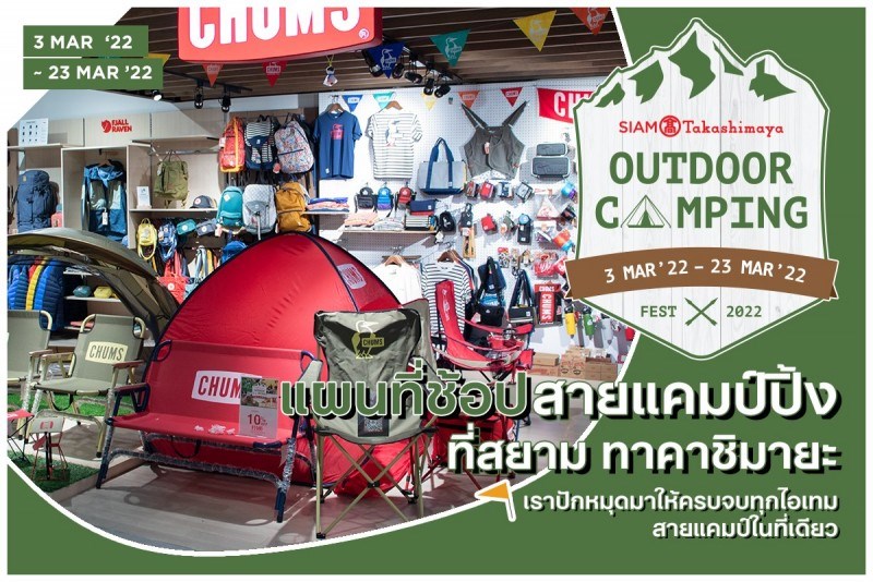 Outdoor Camping Fest 3 มี.ค 65 - 23 มี.ค. 65Men’s Wear ชั้น 3 Siam Takashimaya ห้างสยามทาคาชิมายะ เดสติเนชั่นที่สายแคมป์และผู้รักในไลฟ์สไตล์เอาท์ดอร์ต้องไม่พลาด เรารวมไว้ให้ครบครันกับไอเทมเด็ดแบรนด์คุณภาพญี่ปุ่น แบรนด์ดังที่ชาวแคมป์ต้องพก เครื่องใช้ เครื่องแต่งกายที่ผสานแฟชั่นแมทช์ลงตัวกับกิจกรรมสุดโปรด และโปรโมชันพิเศษสินค้าเคาน์เตอร์ปกติลดสูงสุด 15%* และลดเฉพาะรุ่นสูงสุด 25%* (เฉพาะช่วงเวลาที่กำหนด) รับฟรี! คูปองเงินสดสูงสุด 10% (เมื่อช้อปครบตามเงื่อนไขกำหนด)