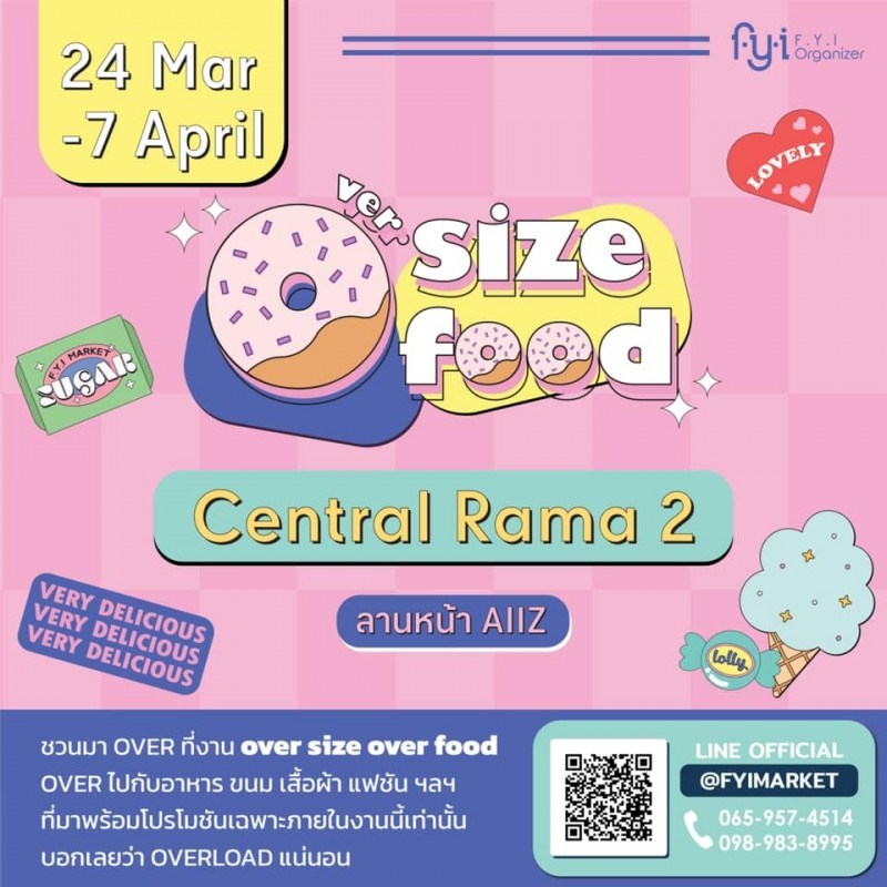 over size over food วันที่ 24 มีนาคม - 7 เมษายน 2565 ณ เซ็นทรัล พระราม 2 งาน over size over food การันตีความเวอร์ เพราะเรารวมสินค้ามากมายมาให้เลือกช้อปครบจบในที่เดียว ทั้งอาหารร้านเด็ดสุดอร่อย ขนมร้านดัง หรือจะเป็นเสื้อผ้า สินค้าแฟชั่นน่ารัก ๆ สวย ๆ เท่ ๆ ที่มาพร้อมกับโปรโมชั่นเฉพาะภายในงานนี้เท่านั้นบอกเลยว่า overload แน่นอน ณ ลานหน้า AIIZ เซ็นทรัลพระราม 2