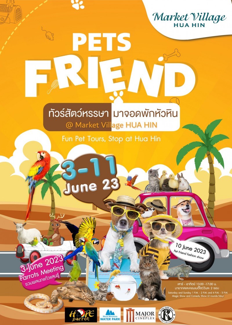 ทัวร์สัตว์หรรษามาแล้ว พร้อมจอดพักรวมพลเหล่าคนรักสัตว์เลี้ยงสุดน่ารัก น้องหมาแสนรู้ /อีกัวน่า/นกอีมู ภายในงานพบกับการแสดงบนเวที สัตว์แปลกอื่น ๆ รวมทั้งร้านจำหน่ายสัตว์เลี้ยง และอุปกรณ์สำหรับสัตว์เลี้ยงต่างๆ ให้ได้เลือกชมเลือกชอปกันอย่างจุใจ รวมไปถึงกิจกรรมป้อนนมปลาคราฟ/ป้อนอาหารกระต่าย/ป้อนนมแพ แกะ/ป้อนอาหารหนูแคสเปี้ยน ตั้งแต่วันที่ 3 - 11 มิ.ย.66 นี้ ที่ชั้น 1 ลาน SeasideCourt หน้าศูนย์การค้ามาร์เก็ตวิลเลจ หัวหิน
