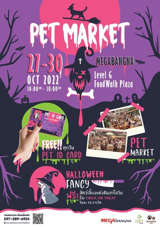 พบกับมาร์เก็ตสินค้า บริการสัตว์เลี้ยงกว่า 40 ร้านค้า พร้อมกิจกรรมพิเศษ ฟรี pet id card น้อง ๆ ที่มาเที่ยวงาน และรับสิทธิพิเศษจากร้านค้าภายในลาน น้อง ๆ แต่งตัวมาเที่ยวงานในตีมฮาโลวีนรับฟรี Trick or Treat (จำกัดวันละ 50 สิทธิ์) ณ ชั้น G FoodWalk Plaza Megabangna Shoppingcenter