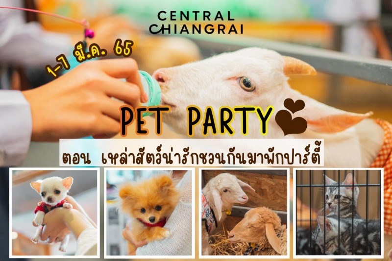 ความน่ารักของเหล่าสัตว์เลี้ยงในงาน "PET PARTY 2022" ตอน เหล่าสัตว์น่ารัก พากันมาพัก ปาร์ตี้ กับกองทัพเหล่าสัตว์แปลก เซเลบน้องหมา น้องแมว โชว์การแสดงจากสัตว์เลี้ยงสุดน่ารัก พร้อมช้อปสินค้าเกี่ยวกับสัตว์เลี้ยงกว่า 10 บูธ อาทิ ป้อนนมแพะแกะ, ป้อนนมปลาคราฟ, ป้อนอาหารกระต่าย, ป้อนอาหารหนูแกสบี้, ป้อนนมหนู, กิจกรรมตักปลาที่มาให้ทุกคนได้เล่นและสนุกสนานกันอย่างจุใจ วันที่ 1 - 7 มีนาคม 2565 ณ ชั้น G โซนแกรนด์ฮอลล์ ศูนย์การค้าเซ็นทรัล เชียงราย