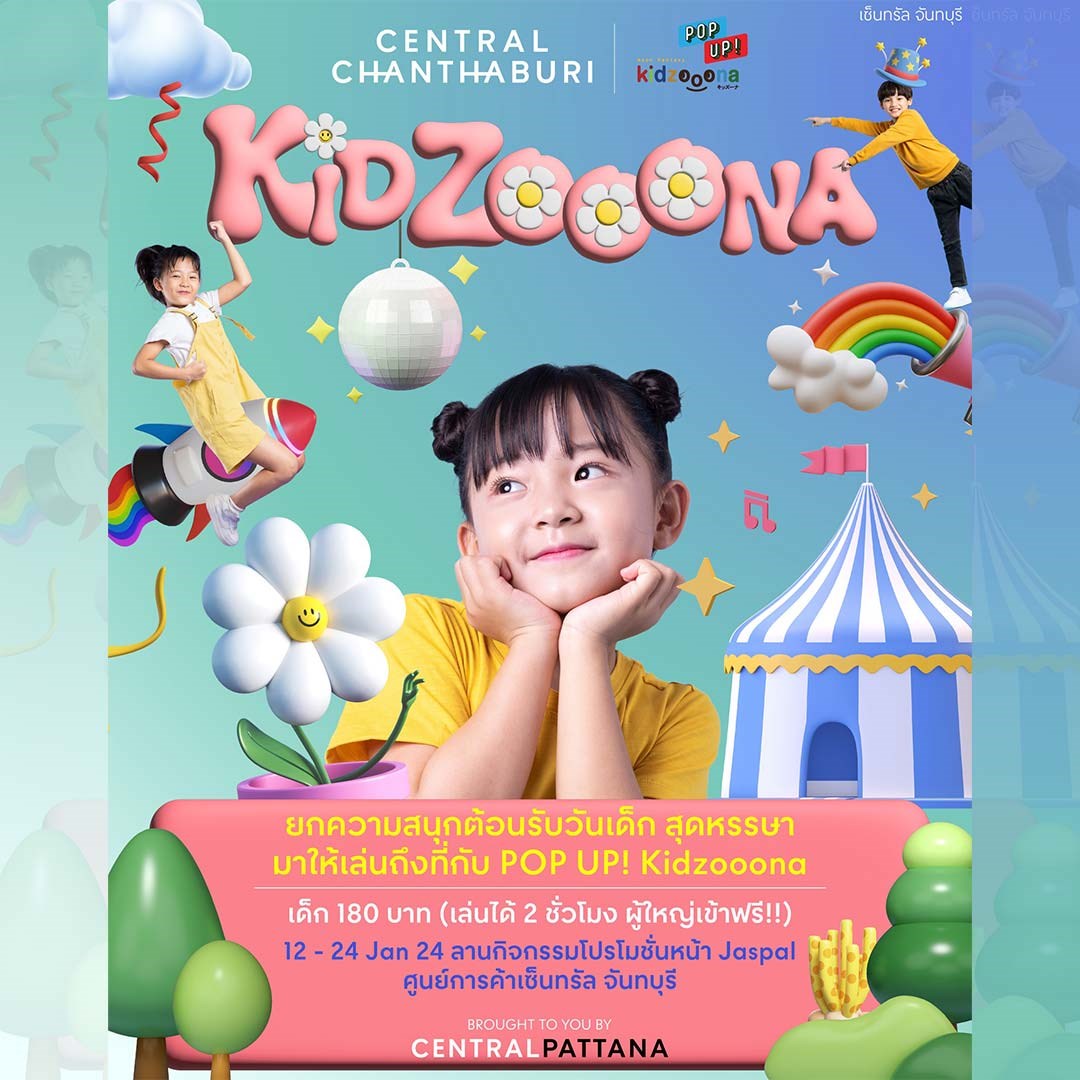 ยกความสนุกต้อนรับวันเด็กสุดหรรษา สนุกเพลิดเพลินไปกับ POP UP! Kidzoona เตรียมร่างกายให้พร้อม มาสนุกแถมเสริมสร้างพัฒนาการไปกับสวนสนุกสุดมันส์ ค่าบริการ เด็ก 180 บาท (เล่นได้ 2 ชั่วโมง ผู้ใหญ่เข้าฟรี!) วันที่ 12 - 24 มกราคม 2567 ณ ลานโปรโมชั่นหน้า Jaspal ชั้น G ศูนย์การค้าเซ็นทรัล จันทบุรี