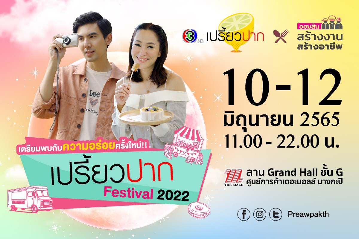 ขาชิมห้ามพลาด! มาอิ่มฟินกันตลอด 3 วัน ที่งาน “เปรี้ยวปาก Festival 2022 อร่อยเงินล้าน สร้างงานสร้างอาชีพ By ธนาคารออมสิน” ระหว่างวันที่ 10 – 12 มิถุนายน 2565 เวลา 11.00 - 22.00 น. ณ Grand Hall ชั้น G เดอะมอลล์ บางกะปิ และพบความคุ้มค่าสุดๆ กับโปรโมชั่นอิ่มอร่อยในราคาพิเศษจากร้านค้าภายในงาน และกิจกรรมสนุกๆ ลุ้นรางวัลใหญ่ และของที่ระลึกจากรายการเปรี้ยวปาก ติดไม้ติดมือกลับบ้านแน่นอน