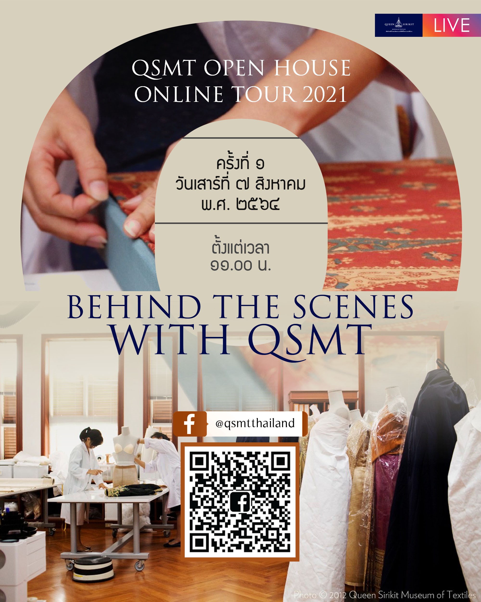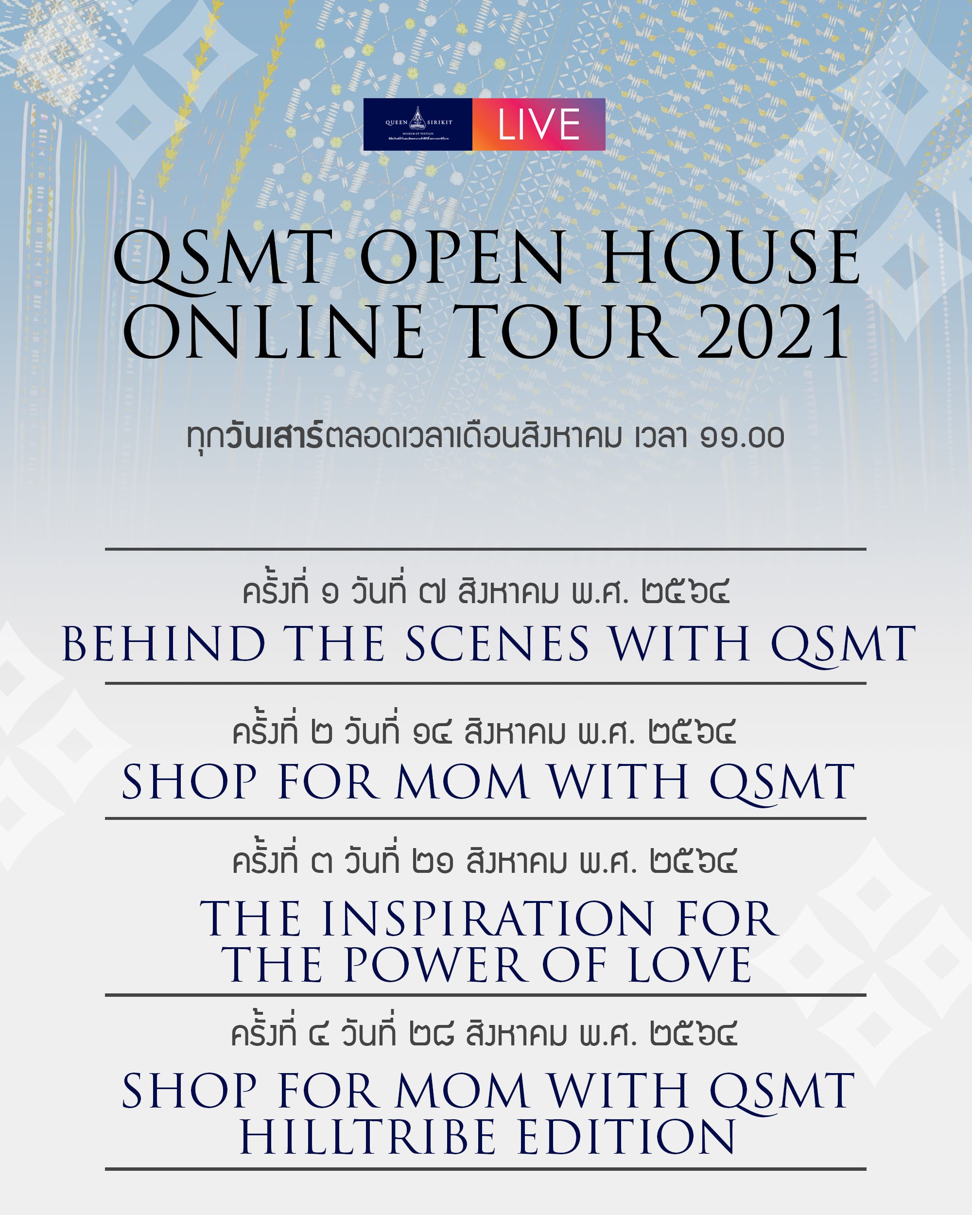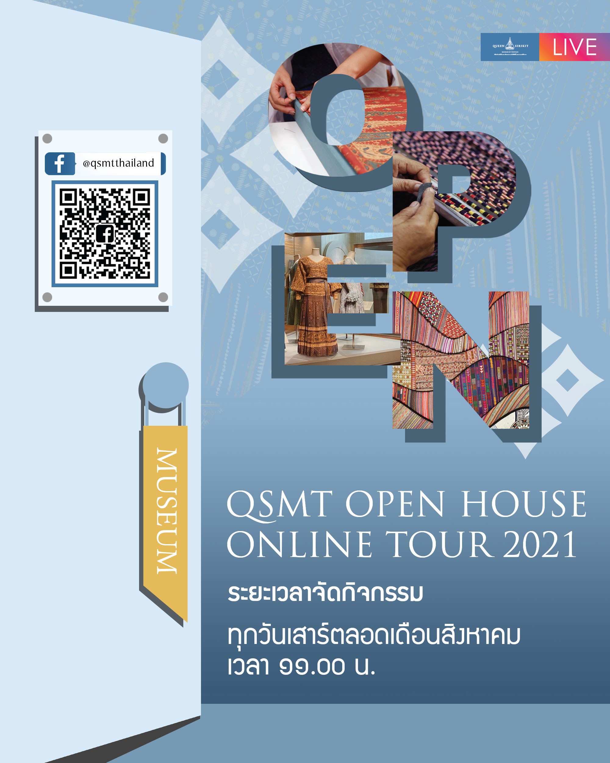 พิพิธภัณฑ์ผ้าในสมเด็จพระนางเจ้าสิริกิติ์ พระบรมราชินีนาถ จะจัดกิจกรรม “QSMT OPEN HOUSE: ONLINE TOUR 2021” แบบออนไลน์ เพื่อให้เหมาะสมกับสถานการณ์และลดความเสี่ยงในการแพร่ระบาดของโรคโควิด - ๑๙ โดยจะพาทุกท่านไปทำความรู้จักกับงานเบื้องหลังของพิพิธภัณฑ์ผ้าฯ ทั้งความรู้ในงานอนุรักษ์ และเผยแพร่ภูมิปัญญาของบรรพบุรุษไทย ควบคู่ไปกับการเลือกชมและช้อปสินค้าจากพิพิธภัณฑ์ผ้า และมูลนิธิส่งเสริมศิลปาชีพฯ ทุกวันเสาร์ ตลอดเดือนสิงหาคม เวลา ๑๑.๐๐ น. เป็นต้นไป ประเดิมเปิดบ้านเสาร์แรก ๖ สิงหาคมนี้