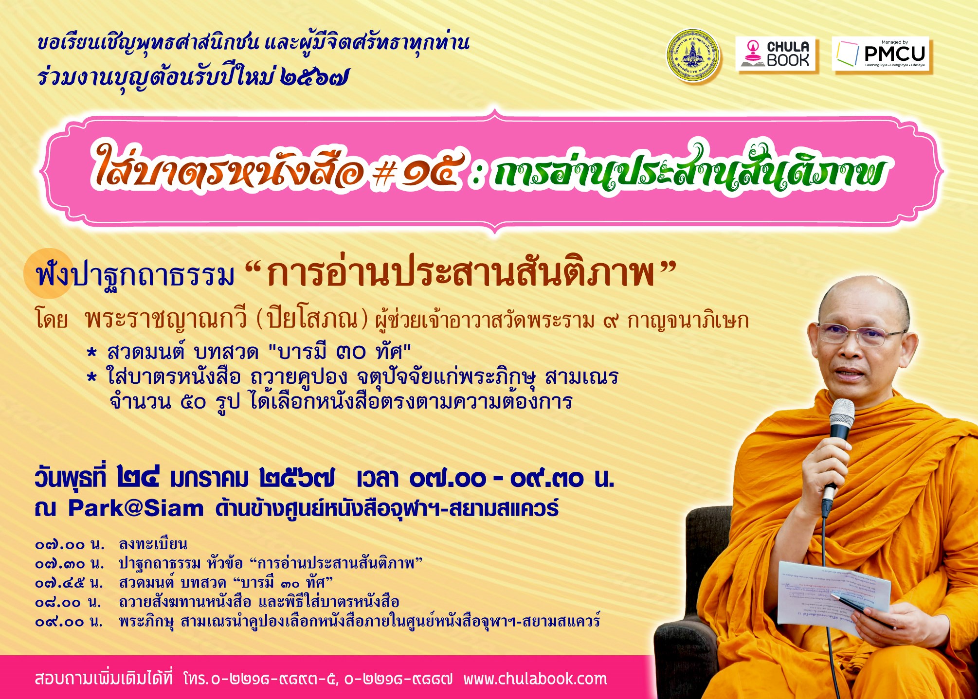 การให้คือพลังอันยิ่งใหญ่ขอเชิญพุทธศาสนิกชนและผู้เลื่อมใสศรัทธาร่วมกิจกรรม“ใส่บาตรหนังสือ ครั้งที่ 15 : การอ่านประสานสันติภาพ” เริ่มศักราชใหม่ด้วยการใส่บาตรหนังสือให้กับพระสงฆ์และสามเณร จำนวน 50 รูป ซึ่งกำลังศึกษาอยู่ในโรงเรียนพระปริยัติธรรม ด้วยอานิสงส์ของการบริจาคหนังสือเป็นการเพิ่มวาสนา บารมี สติปัญญา เป็นที่นับหน้าถือตาในสังคม รวมถึงการได้สนับสนุนด้านการศึกษาแด่พระภิกษุและสามเณร อีกทั้งยังมีปาฐกถาธรรมหัวข้อ “การอ่านประสานสันติภาพ” โดย พระราชญาณกวี (ปิยโสภณ) ผู้ช่วยเจ้าอาวาสวัดพระราม ๙ กาญจนาภิเษก พร้อมทั้งขอเชิญร่วมกันสวดมนต์ บทสวด “บารมี 30 ทัศ” เพื่อความเป็น สิริมงคล ในวันพุธที่ 24 มกราคม 2567 เวลา 06.00 – 09.00 น. ณ Park @ Siam ด้านข้าง ศูนย์หนังสือจุฬาฯ สยามสแควร์หรือสอบถามเพิ่มเติมได้ที่ โทร.0-2218-9893-5