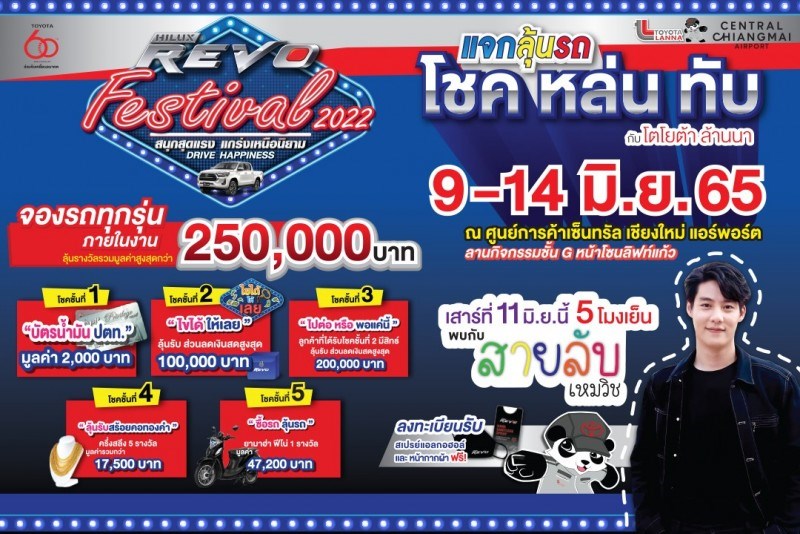Revo Festival 2022 วันที่ 9 - 14 มิถุนายน 2565 ณ ศูนย์การค้าเซ็นทรัล เชียงใหม่ แอร์พอร์ต พบกับงาน "Revo Festival 2022" สนุกสุดแรง แกร่งเกินนิยาม Drive Happiness งานที่มาพร้อมความสนุกสนานและของรางวัลมากมาย สำหรับชาวเชียงใหม่โดยเฉพาะ ในวันที่ 9 - 14 มิถุนายนนี้ สุดว้าว สำหรับลูกค้าที่จองในงานและจองผ่านช่องทางออนไลน์ แคมเปญพิเศษ ออกรถ 0* บาท พร้อมโชค หล่น ทับ "แจก ลุ้น รถ" โชค 5 ชั้น มูลค่ารวมสูงสุด 250,000 โชคชั้นที่ 1 รับบัตรเติมน้ำมัน ปตท. มูลค่า 2,000 บาท โชคชั้นที่ 2 ไขได้ให้เลย ลุ้นรับส่วนลดเงินสดสูงสุด 100,000 บาท โชคชั้นที่ 3 ไปต่อ หรือพอแค่นี้ ลูกค้าผู้โชคดีจากโชคชั้นที่ 2 มีสิทธิ์ลุ้นรับรางวัลส่วนลดเงินเพิ่มสดสูงสุด 200,000 บาท โชคชั้นที่ 4 ลุ้นรับสร้อยคอทองคำ ครึ่งสลึง จำนวน 5 รางวัล มูลค่ารวมกว่า 17,500 บาท โชคชั้นที่ 5 ซื้อรถ ลุ้นรถ ลุ้นรับมอเตอร์ไซค์ ยามาฮ่าฟีโน่ 1 รางวัล มูลค่า 47,200 บาท พบกับความบันเทิงแบบจัดเต็มในวันหยุด วันเสาร์ที่ 11 มิ.ย. เวลา 17.00น. เป็นต้นไป พบกับ "สายลัย" เหมวิช ดาราหนุ่มหล่อที่มาสร้างสีสันและร่วมกิจกรรมมอบของรางวัลภายในงาน วันอาทิตย์ที่ 12 มิ.ย. พบกับ Cover Dance Show จาก Dance Zone และ Magic Show พิเศษ! ลงทะเบียนภายในงานรับฟรี สเปร์แอลกอฮอร์ และ หน้ากากผ้า รับชมกิจกรรมตลอดงานได้ทุกวัน ผ่าน Live @Toyota lanna www.facebook.com/toyotalanna รับโชคสุดคุ้ม ลุ้น แจก รถ กับโตโยต้า ล้านนา ตลอด 6 วันเต็ม! ตั้งแต่วันที่ 9 - 14 มิถุนายน 2565 เวลา 10.00 - 21.00 น. ณ ลานกิจกรรมชั้น G หน้าโซนลิฟต์แก้ว ศูนย์การค้าเซ็นทรัล เชียงใหม่ แอร์พอร์ต อย่าพลาด ! ออกรถง่าย ได้ทุกอาชีพ ต้องโตโยต้าล้านนาเท่านั้น *เงื่อนไขเป็นไปตามบริษัทกำหนด