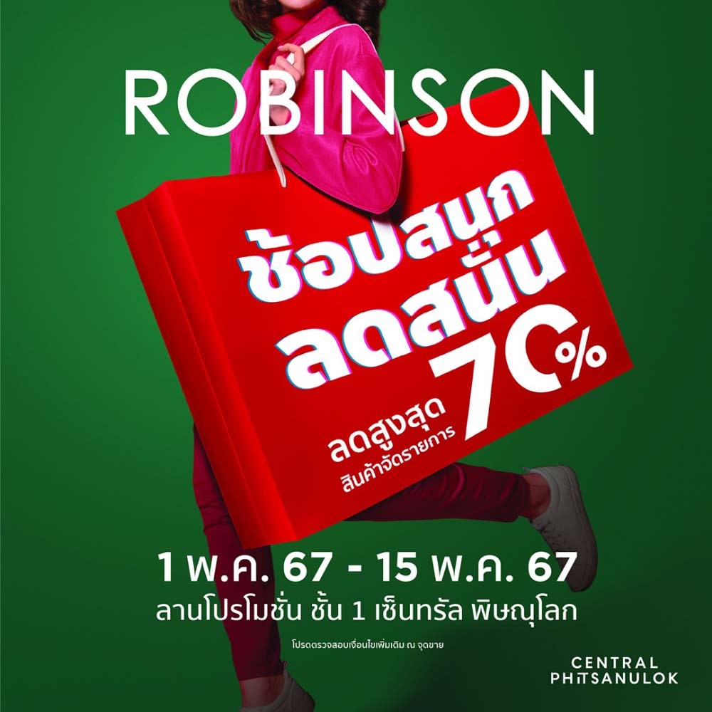 โรบินสัน ช้อปสนุก ลดสนั่น งานนี้ sale สนั่น กับสินค้าลดสูงสุด 70% พลาดไม่ได้! กับแบรนด์ชั้นนำ อาทิ Beverly Hills Polo Club, นิยม ยีนส์, Keep, Fitflop, Heavy, Baoji, Roving Fox, IQ Spot พร้อมรับสิทธิพิเศษเพิ่มเติมจากบัตรเครดิตที่ร่วมรายการ รวมสูงสุด 30%