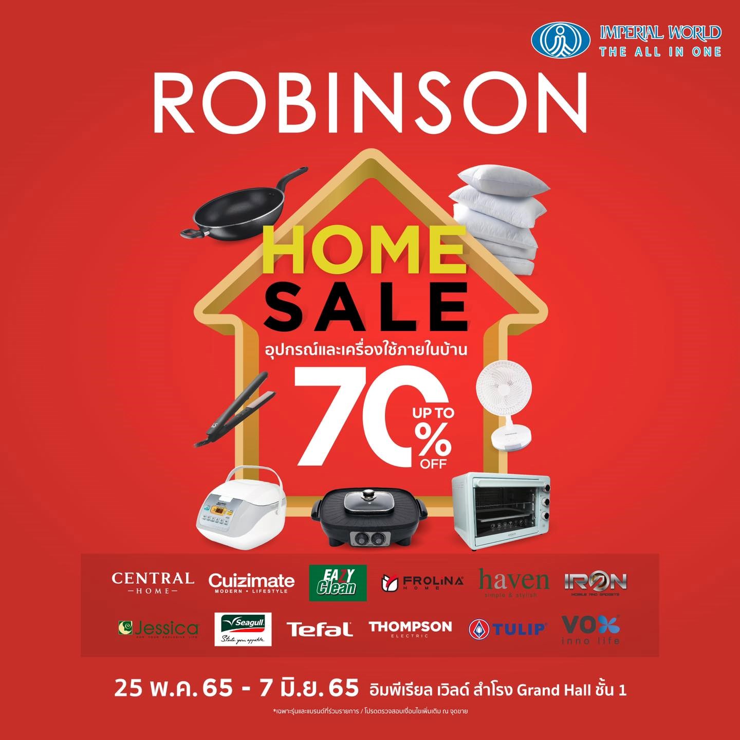 ROBINSON HOME SALE ลดสูงสุด 70% พบกับ สินค้าเครื่องใช้ภายในบ้าน ตอบโจทย์ไลฟ์สไตล์คนเมือง และโปรโมชั่นสุดคุ้มอีกมากมาย ระหว่างวันที่ 25 พ.ค. - 7 มิ.ย. 65 ณ บริเวณ Grand Hall ชั้น 1 ศูนย์การค้าอิมพีเรียล เวิลด์ สำโรง