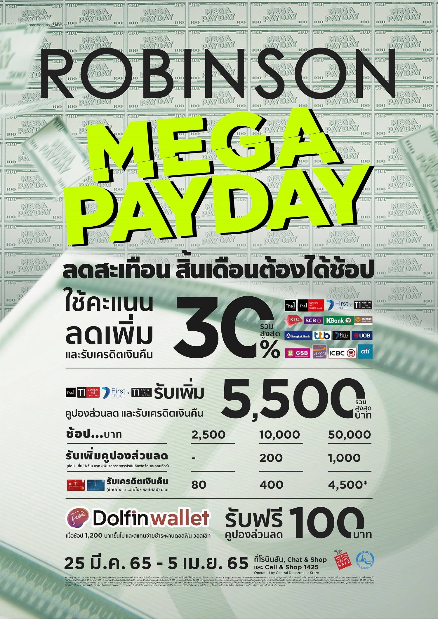 ห้างสรรพสินค้าโรบินสัน ในเครือเซ็นทรัล รีเทล จัดแคมเปญสุดคุ้มช่วงสิ้นเดือน Robinson Mega Payday” (โรบินสัน เมกา เพย์ เดย์) #ลดสะเทือนสิ้นเดือนต้องได้ช้อป ที่มาพร้อมดีลโปรโมชั่นสุดพิเศษเอาใจสาย    ช้อปมากมาย ไม่ว่าจะเป็น...