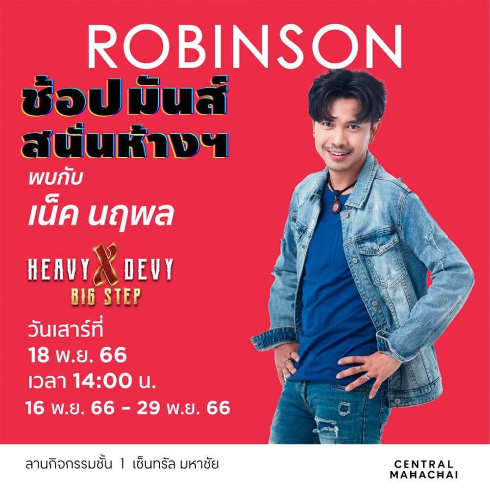 พบกับ เน็ค นฤพล เจ้าของบทบาท บักเจิด ในภาพยนตร์เรื่อง สัปเหร่อ นักร้องและนักแสดง ที่กำลังทำรายได้ทะยานสู่ 700 ล้าน วันเสาร์ ที่ 18 พ.ย. 66 เวลา 14.00 น. ในมินิคอนเสิร์ต งาน "ROBINSON ช้อปมันส์ สนั่นห้างฯ HEAVY x DEVY BIG STEP"