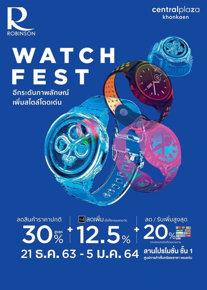 ROBINSON WATCH FEST วันเที่ 21 ธันวาคม 2563 - 5 มกราคม 2564 ณ ลานโปรโมชั่น ชั้น 1 ศูนย์การค้าเซ็นทรัลพลาซา ขอนแก่น สิ้นสุดการรอคอย!! สุดยอดงานนาฬิกาแห่งปี ROBINSON WATCH FEST @ROBINSON KHONKAEN ลดสูงสุด70% ปรากฎการณ์รวบรวม ที่สุดแห่งเรือนเวลาและเครื่องประดับ พร้อมนําเสนอคอลเลกชั่นล่าสุดมาอวดความงามเต็มรูปแบบ กับแบรนด์นาฬิกาชั้นนำ อาทิ LONGINES, RADO, MIDO,TISSOT, TIMEX, NIXON, ANNE KLEIN, ESPRIT, WISE, CITIZEN, CASIO, GUESS, GC, SEIKO, TITAN, GIORDANO, JULIUS และอีกมากมาย ที่จะมาสร้างความคุ้มค่าให้แก่คุณเพียงแค่ได้สวมใส่