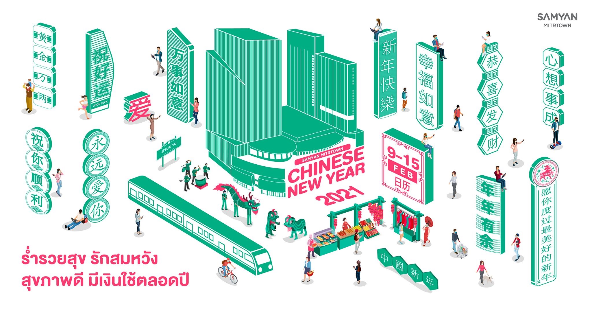 Chinese New Year 2021 "ร่ำรวยสุข รักสมหวัง สุขภาพดี มีเงินใช้ตลอดปี" วันที่ 9 - 15 กุมภาพันธ์ 2564 ณ ศูนย์การค้าสามย่าน มิตรทาวน์ ครั้งแรก! ที่ ศูนย์การค้าสามย่านมิตรทาวน์ ชวนมิตรร่วมเฉลิมฉลอง 2 เทศกาล ในเดือนกุมภาพันธ์อย่างยิ่งใหญ่ในงาน Chinese New Year 2021 "ร่ำรวยสุข รักสมหวัง สุขภาพดี มีเงินใช้ตลอดปี" เนรมิตบรรยากาศภายในศูนย์ฯ ต้อนรับเทศกาลตรุษจีน และวาเลนไทน์ ในธีมป๊อปคัลเจอร์และคาเฟ่สไตล์จีนสุดชิค สะท้อนกลิ่นอายศิลปวัฒนธรรมแบบร่วมสมัยของจีนในโทนสีเขียวหยก ซึ่งเป็นสัญลักษณ์แทนความเป็นมงคลของการเริ่มปีใหม่ในตำราจีน และสีชมพู ตัวแทนดอกโบตั๋น สื่อถึงความรัก และยังคงกลิ่นอายความเป็นจีนไว้ด้วยเช่นกัน