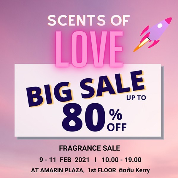 SCENTS OF LOVE BIG SALE 80% วันที่ 9 - 11 กุมภาพันธ์ 2564 ณ ชั้น 1 อัมรินทร์พลาซ่า มาแล้วงานที่ทุกคนรอคอย 3 วันเท่านั้น!! กับงาน Sale น้ำหอมและเครื่องสำอางค์แบรนด์ระดับโลก อย่าง Versace, Moschino, Juicy Couture, Kathy Perry, Paris Hilton, Ferrari และอื่นๆ อีกมากมายที่รอเพื่อน ๆ มาขนกลับบ้าน