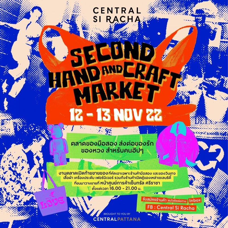 Second Hand and Craft Market ตลาดของมือสอง ส่งต่อของรัก ของหวง สำหรับคนฮิป ๆ และเหล่าเซเลบริตี้ศรีราชา วันที่ 12 - 13 พ.ย. 65 เวลา 16.00 - 21.00 น. ที่ลานหน้าศูนย์การค้าเซ็นทรัล ศรีราชา ไม่ว่าจะเป็นเสื้อผ้า, กระเป๋า, รองเท้า, ของวินเทจ, เครื่องประดับ, หรือเฟอร์นิเจอร์ จะเปิดท้าย แบกับดิน แขวนราว