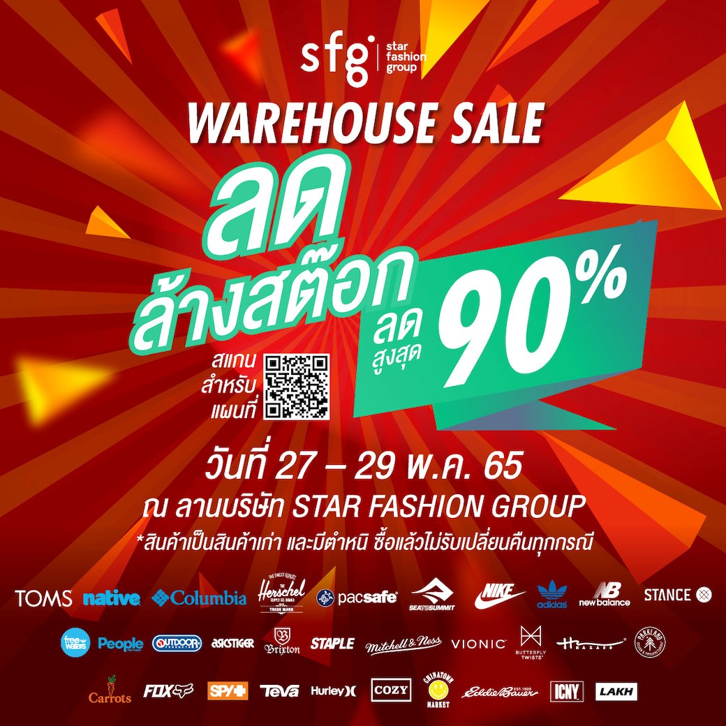 ลดกระหน่ำ ระเบิดกรุ ล้างสต๊อกกับงาน SFG Warehouse Sale งานโคตรเซล ขนทัพสินค้าชั้นนำมาลดสูงสุด 90% ขนสินค้าแบรนด์ชั้นนำ มาลดกระหน่ำให้หนำใจ 3 วันเต็ม นำขบวนโดย Toms, Herschel, Columbia, Nike, Adidas, New Balance, Native, Pacsafe, Sea to Summit, Hazard, Freewaters, People, Outdoor, Parkland, Butterfly Twists, Vionic, Stance, Chinatown Market, Asicstiger, Fila, Teva, Carrots, Staple, Brixton, Mitchell&ness และแบรนด์อื่น ๆ อีกมากมาย