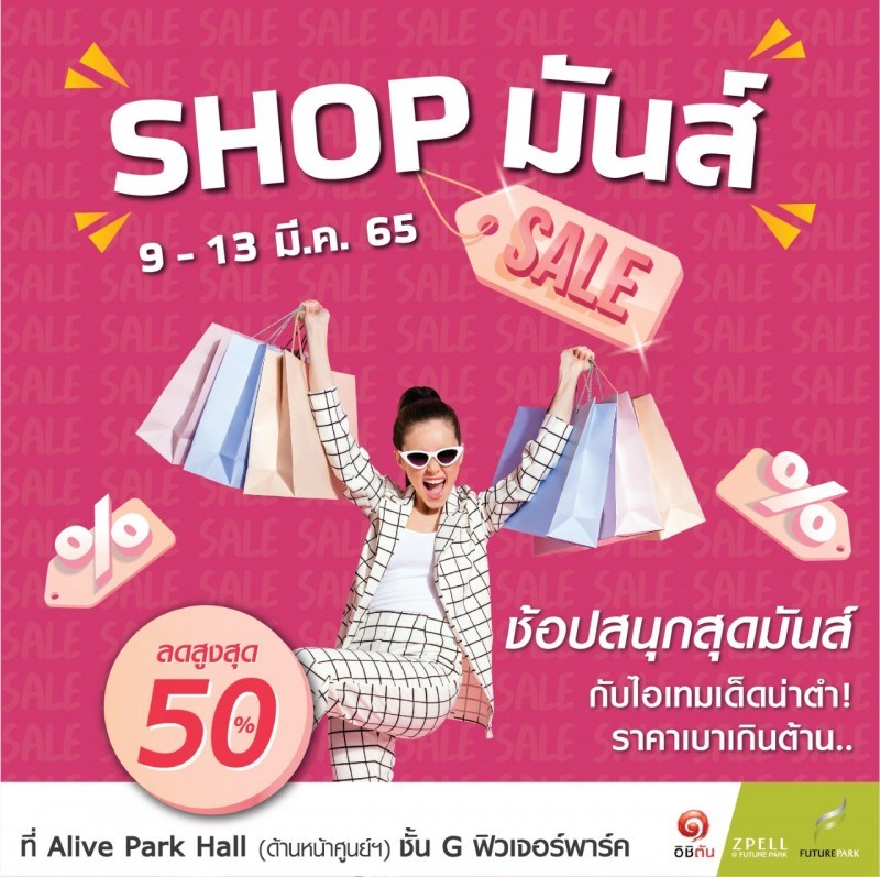 ช้อปเพลินแบบไม่ต้องเดินให้เมื่อย ไว้งานนี้ที่เดียว ในงาน "SHOP มันส์" ระหว่างวันที่ 9 - 13 มีนาคม 2565 ชั้น G Alive Park Hall ศูนย์การค้าฟิวเจอร์พาร์ค