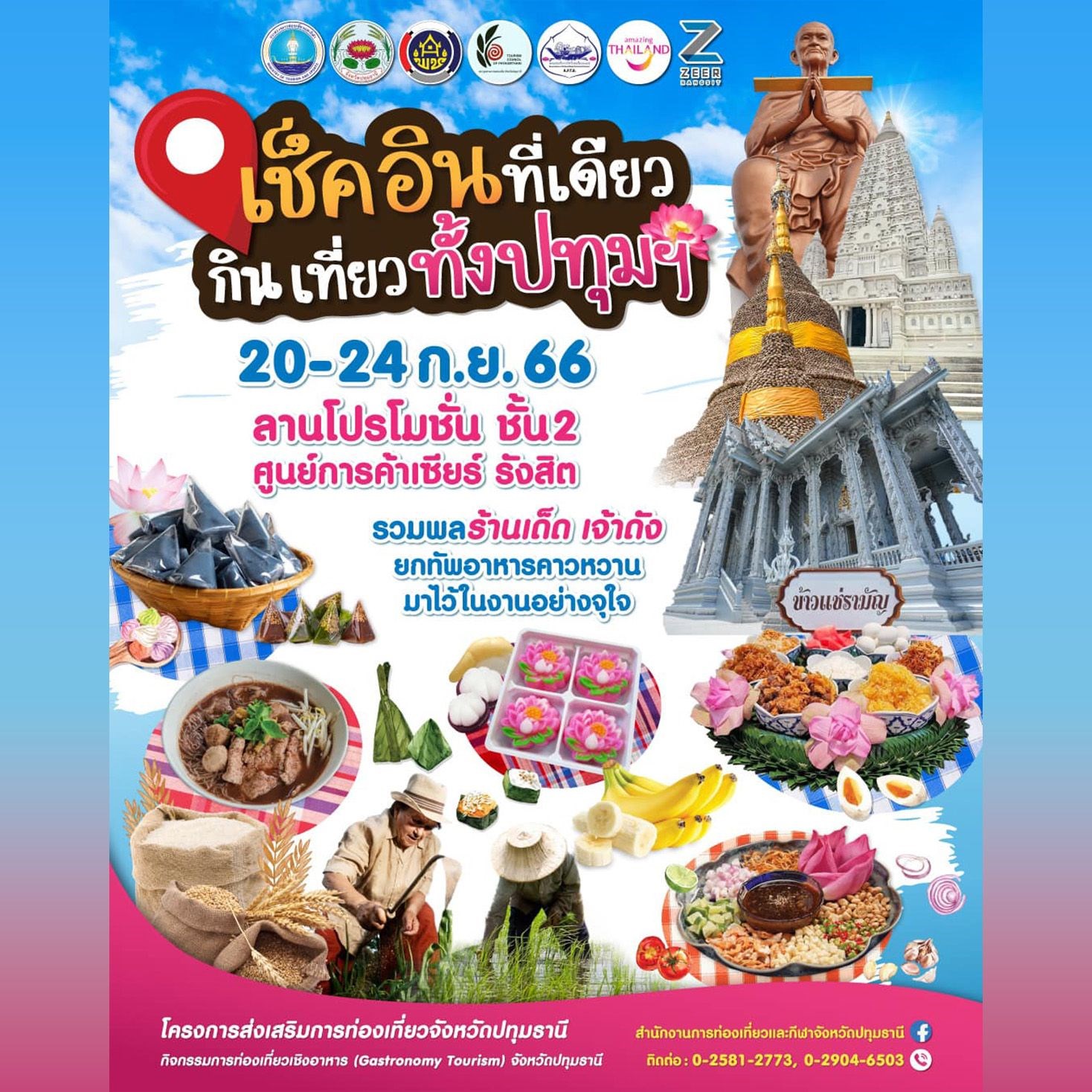 สำนักงานการท่องเที่ยวและกีฬาจังหวัดปทุมธานี และ ศูนย์การค้าเซียร์ รังสิต ขอเชิญทุกท่านมาเช็คอินและกินของอร่อยที่งาน "เช็คอินที่เดียว กิน เที่ยวทั้งปทุมฯ" รวมพลร้านเด็ด รัานดัง ร้านลับ ยกทัพอาหารคาวหวาน ให้ทุกท่านได้มาเลือกชม ช้อป ชิมอาหารและสินค้า กับเทศกาลส่งเสริมการท่องเที่ยวเชิงอาหาร ของจังหวัดปทุมธานี รวบรวมมาไว้ในงานอย่างจุใจ ไม่น้อยกว่า 30 ร้าน ตั้งแต่วันที่ 20 - 24 กันยายน 2566 ณ ลานโปรโมชั่น ชั้น2 ศูนย์การค้าเซียร์ รังสิต