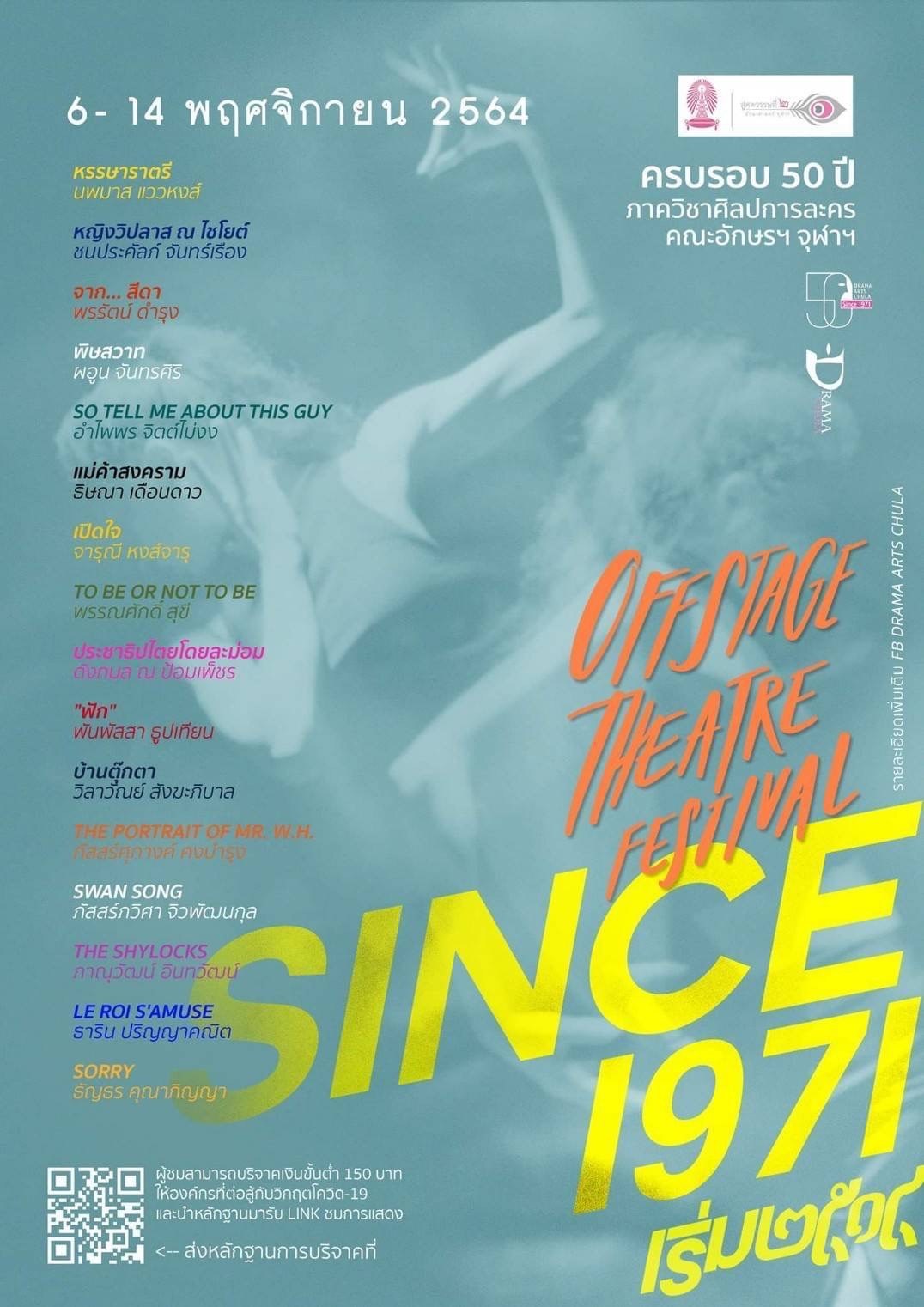 ภาควิชาศิลปการละคร คณะอักษรศาสตร์ จุฬาลงกรณ์มหาวิทยาลัย ขอเชิญชม Since 1971 (เริ่ม ๒๕๑๔) เทศกาลละครนอกโรง (Offstage Theatre Festival) เนื่องในวาระครบรอบ 50 ปีการก่อตั้งภาควิชาศิลปการละคร