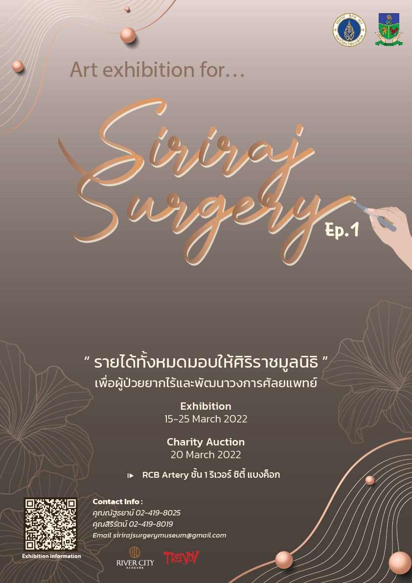 To commemorate 150 years of the Department of Surgery and 1 year of Siriraj Surgery Museum on 1 April 2022, Faculty of Medicine Siriraj Hospital, Mahidol University organized this exhibition to donate all proceeds to Siriraj Foundation to help needy patients and support the surgical field. The exhibition showcases artworks by a wide range of artists including Dr. Suchart Vongthong, Sakwut Wisesmanee as well as renowned street artists - Benzilla and 2Choey.