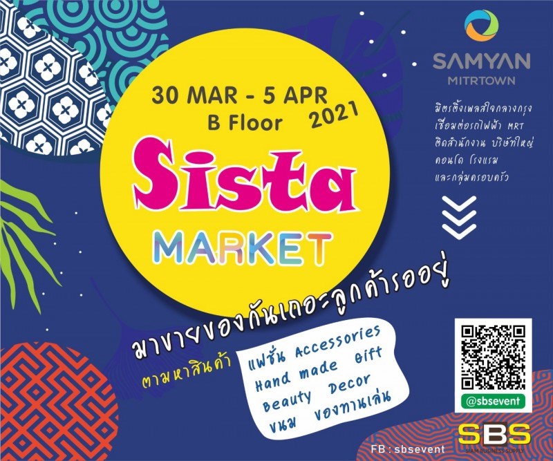 SISTA MARKET วันที่ 30 มีนาคม 2564 - 5 เมษายน 2564 ณ ชั้น B1 หน้า BIG C สามย่านมิตรทาวน์ เตรียมหน้าผมชุดให้พร้อมรับซัมเมอร์นี้ จูงมือไปช้อปงานนี้กันเลยค่ะซิส ช้อปเพลินเดินชิล อัพเดทไอเท็มที่สาวๆ ต้องมี ทั้งเสื้อผ้า เครื่องประดับ กระเป๋า รองเท้า สินค้าน่ารัก ๆ ราคาสบายกระเป๋า