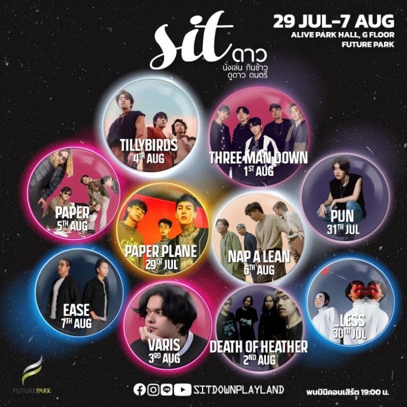 ศูนย์การค้าฟิวเจอร์พาร์ค ชวนช้อปสไตล์สายฮิป กับงาน "Sit ดาว" คัดสรรสินค้าเก๋ ๆ มีดีไซน์มารวมไว้ที่เดียว ให้เลือกช้อปได้ทั้งของกินของใช้ พร้อมกิจกรรมบันเทิง และคอนเสิร์ตจากศิลปินดัง ตั้งแต่วันที่ 29 กรกฏาคม - 7 สิงหาคม 2565 ณ อะไลฟ์พาร์ค ฮอลล์ ชั้น G ศูนย์การค้าฟิวเจอร์พาร์ค "Sit ดาว" จัดเต็มงานแฟชั่นปะทะดนตรี สำหรับนักช้อปสายฮิป ที่ชอบบรรยากาศชิว ๆ เดินเพลิดกับแฟชั่นสไตล์เฉพาะคุณ ไม่ว่าจะเป็นเสื้อผ้าแฟชั่น, Accessory, อุปกรณ์ตกแต่งมือถือสุดแนว และความอร่อยหลายรูปแบบจากร้านอาหารท๊อปชาร์ตรีวิว พร้อมกิจกรรมบนเวที, มินิคอนเสิร์ตจากศิลปินชื่อดัง PAPER PLANE 29 JUL, LESS 30 JUL, PUN 31 JUL, THREE MAN DOWN 1 AUG, DEATH OF HEATHER 2 AUG, VARIS 3 AUG, TILLYBIRDS 4 AUG, PAPER 5 AUG, NAP A LEAN 6 AUG, EASE 7 AUG แล้วพบกับกิจกรรมสนุก ๆ อีกมากมายภายในงาน นั่งเล่น กินข้าว ดูดาว ฟังดนตรี กับงาน "Sit ดาว" ตั้งแต่วันที่ 29 กรกฏาคม - 7 สิงหาคม 2565 ณ อะไลฟ์พาร์ค ฮอลล์ ชั้น G ศูนย์การค้าฟิวเจอร์พาร์ค