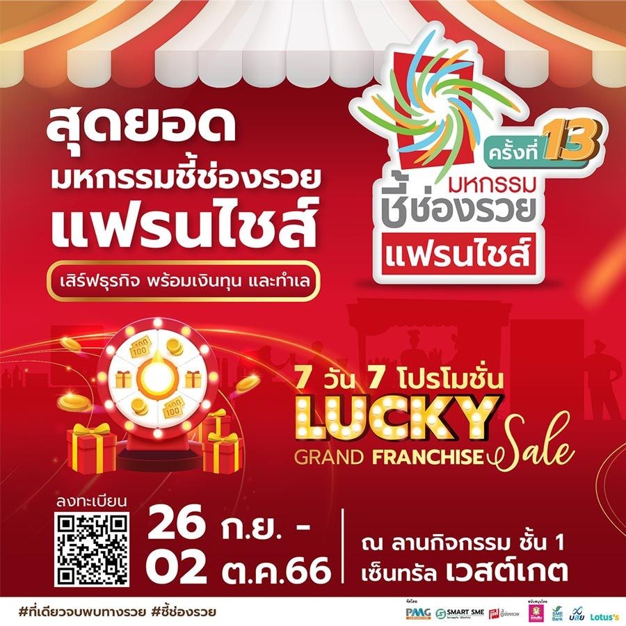 มหกรรมชี้ช่องรวยแฟรนไชส์ ครั้งที่ 13 เสิร์ฟธุรกิจกว่า 50 แบรนด์ พร้อมแหล่งเงินทุนและทำเลเด่น Lucky Grand Franchise Sale ให้คุณชอปธุรกิจได้ 7 วัน 7 โปรโมชั่น พร้อมทั้งกิจกรรมสัมมนาธุรกิจและสาธิตอาชีพฟรีตลอดงาน วันที่ 26 กันยายน - 2 ตุลาคม 2566 ณ ลานกิจกรรม ชั้น 1 เซ็นทรัล เวสต์เกต ลงทะเบียนเข้าร่วมงาน https://bit.ly/CHICHONGRUAY
