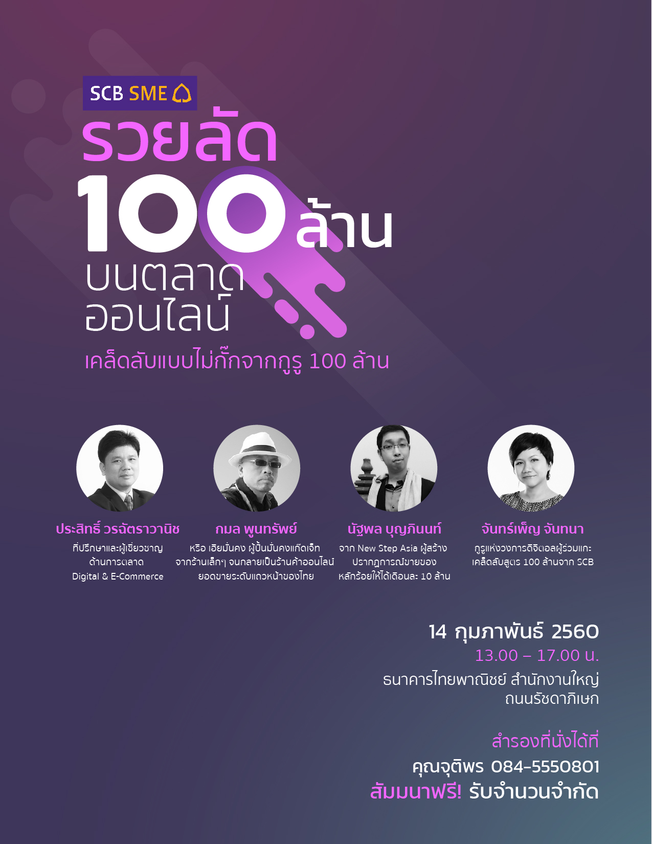และพบกับกูรูแห่งวงการดิจิตอลคุณจันทร์เพ็ญ จันทนา จาก SCB  ที่จะมาร่วมแกะเคล็ดลับสูตร 100 ล้านให้แก่ผู้เข้าร่วมสัมมนา