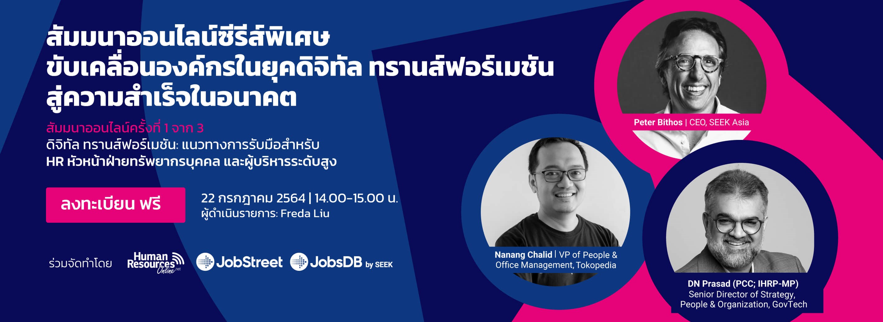 ฟรี! สัมมนาออนไลน์สำหรับผู้บริหารองค์กร SME หัวหน้าฝ่ายทรัพยากรบุคคล และผู้บริหารระดับสูง หากอยากต้องการเปลี่ยนแปลงองค์กรสู่ยุคดิจิทัลอย่างแข็งแกร่ง ต้องไม่พลาดเข้าร่วมสัมมนาออนไลน์ซีรีส์พิเศษนี้ พบผู้เชี่ยวชาญระดับภูมิภาคที่จะมาแบ่งปันข้อมูลเชิงลึกและแนวคิดเกี่ยวกับดิจิทัล ทรานส์ฟอร์เมชัน เริ่มวันที่ 22 กรกฎาคม 2564 เวลา 14.00-15.00 น. สนใจลงทะเบียนคลิก https://jobsdb.me/SMEWebinar-social