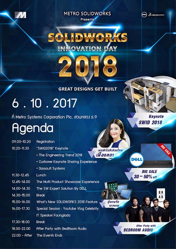 บริษัท เมโทรซิสเต็มส์คอร์ปอเรชั่น จำกัด (มหาชน) แผนก Design & Engineering Solutions จัดงาน SOLIDWORKS Innovation Day 2018” ที่สำนักงานใหญ่ เมโทรแคมปัส ในวันศุกร์ที่ 6 ตุลาคม 2560 เพื่อตอกย้ำถึงการเป็นผู้แทนจำหน่ายผลิตภัณฑ์ซอฟต์แวร์ออกแบบผลิตภัณฑ์และวิศวกรรมระดับโลกในประเทศไทย พบกับการเปิดตัว SOLIDWORKS เวอร์ชั่นใหม่ล่าสุด 2018 ท่านจะได้สัมผัสและพบกับฟีเจอร์ใหม่ของซอฟต์แวร์ SOLIDWORKS ซึ่งจะเข้ามาช่วยให้ท่านออกแบบและวิเคราะห์ชิ้นงานได้อย่างรวดเร็ว โซลูชันการออกแบบครบวงจรทำให้กระบวนการทำงานมีประสิทธิภาพสูงสุด แล้วยังได้ทดลองใช้ซอฟต์แวร์ SOLDIWORKS 2018 ก่อนใคร โดยภายในงานมีกิจกรรมที่น่าสนใจมากมาย ทั้งการแสดงผลิตภัณฑ์และเทคโนโลยีของบริษัทเมโทรซิสเต็มส์ฯ และคู่ค้า การบรรยายพิเศษจากบริษัท AAPICO เพื่อแบ่งปันประสบการณ์ในการพัฒนาและผลักดันนวัตกรรมให้เพิ่มขึ้น โดยเฉพาะด้านผลิตภัณฑ์อุตสาหกรรม ซึ่งเป็นปัจจัยลำดับต้นๆ ของการขับเคลื่อนพื้นฐานเศรษฐกิจประเทศ และยังเป็นการสร้างความแข็งแกร่งให้กับภาคธุรกิจได้อย่างยั่งยืน ภายในงานยังมีแขกรับเชิญพิเศษมาสร้างสีสันและความสนุก ได้แก่ คุณเฟื่องลดา สรานี สงวนเรือง นางฟ้าไอที ที่จะมาแชร์ข้อมูลไอที เทคโนโลยีใหม่ๆ เพื่อให้ทุกท่านนําไปประยุกต์ใช้ในชีวิตประจําวันได้  พร้อมจะมามอบความบันเทิงพร้อมสาระอย่างเต็มเปี่ยม รวมทั้งได้รับสิทธิลุ้นรางวัลใหญ่ iPad, Apple Watch, Dell Notebook และรางวัลอื่นๆ อีกมากมาย พลาดไม่ได้เชิญร่วมรับประทานอาหารเลิศรสจากทั่วกรุงเทพฯ