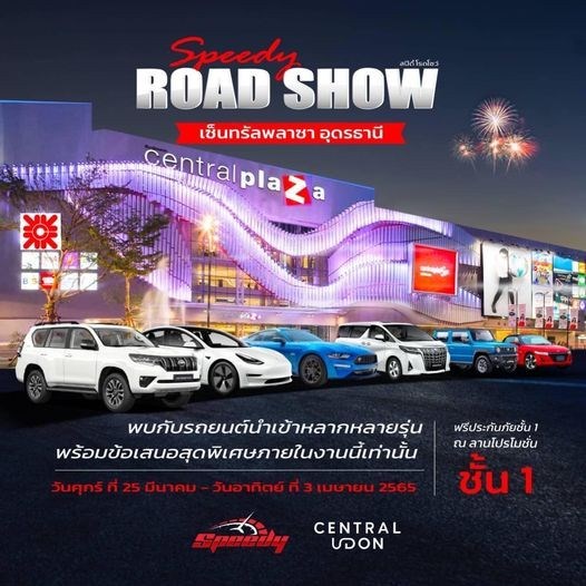 Speedy Road Show วันที่ 25 มีนาคม - 3 เมษายน 2565 ณ เซ็นทรัล อุดร Speedy Road Show "ชาวอุดรฯ และจังหวัดใกล้เคียง" จะได้พบกับรถยนต์นำเข้าหลากหลายรุ่น และรถไฮไลท์อย่าง MUSTANG 2.3 ECO-BOOST, คูเป้เปิดประทุน ALL NEW HONDA S660, TOYOTA ALPHARD HYBRID 2022 และ Toyota Prado TXL 2.8L Diesel งานนี้ฟรีประกันภัยชั้น 1 พร้อมรับข้อเสนอสุดพิเศษมากมาย เจอกันที่ลานกิจกรรมชั้น 1 เซ็นทรัล อุดร ตั้งแต่วันนี้ - 3 เม.ย. 65