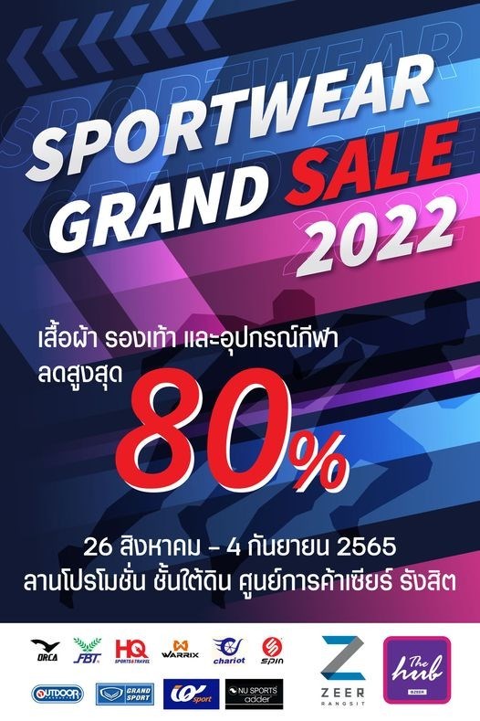 Sports Wear Grand Sale up to 80% หนุ่มสาวสายสปอร์ตที่กำลังมองหาสินค้าอย่าง อุปกรณ์ออกกำลังกาย หรือ ชุดออกกำลังกาย พบกับแคมเปญเอาใจนักช้อปกับโปรโมชั่นสุด Grand! ในช่วงเวลา 26 ส.ค. - 4 ก.ย. 65 งานนี้สายสุขภาพ สายออกกำลังกาย ไม่ควรพลาด! ณ ลานโปรโมชั่น ชั้นใต้ดิน ศูนยการค้าเซียร์ รังสิต