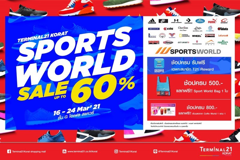 SPORTS WORLD SALE วันที่ 16 - 24 มีนาคม 2564 ณ ชั้น G-ไอเฟล สแควร์ Terminal21 โคราช SPORTS WORLD SALE!!! ชวนมาสอยกับ สินค้าแบรนด์กีฬาดัง อาทิ รองเท้า, เสื้อผ้า, อุปกรณ์ออกกำลังกาย และอุปกรณ์สาย Adventure มากมายจาก Adidas, Nike, Converse, Puma, Under Armour ฯลฯ อื่น ๆ อีกเพียบ