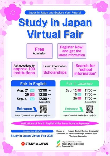 Japan Student Services Organization (JASSO) will be hosting Study in Japan Virtual Fair (Fair in English) from August to September 2021. Any students interested in studying at schools in Japan are welcome no matter where you are currently living in. Approx. 100 schools including universities, professional training colleges and Japanese language institutes will participate in the Virtual Fair. For more information, check our websites !