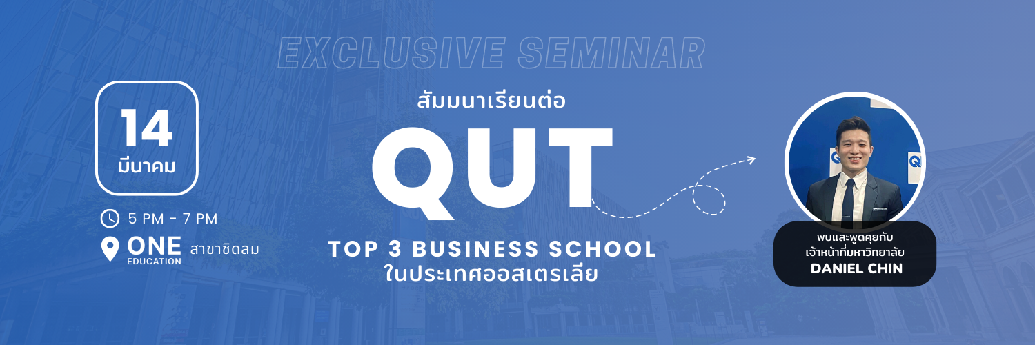 สัมมนาที่คุณจะได้ทำความรู้จัก Queensland University of Technology (QUT) มหาวิทยาลัยชั้นนำในเมืองบริสเบน และติดอันดับ Top 3 Best Business School ในประเทศออสเตรเลีย พร้อมทั้งได้พูดคุยและถามทุกข้อสงสัยกับตัวแทนมหาวิทยาลัยโดยตรง