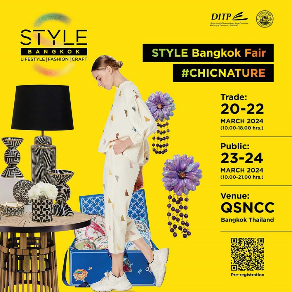 เตรียมพบกับงาน STYLE Bangkok 2024 งานแสดงสินค้าไลฟ์สไตล์และแฟชั่นระดับแถวหน้าของเอเชีย ด้วยความร่วมมือระหว่าง กรมส่งเสริมการค้าระหว่างประเทศ (DITP) กระทรวงพาณิชย์ และสภาหอการค้าแห่งประเทศไทย (BOT) ซึ่งภายในงาน STYLE Bangkok ได้รวบรวมสินค้าไลฟ์สไตล์และแฟชั่นที่มีแนวคิดสู่ความยั่งยืนไว้มากที่สุด ร่วมกันเป็นส่วนหนึ่งในการผลักดันให้สินค้าไลฟ์สไตล์และแฟชั่นไทยเป็นที่รู้จักแพร่หลายในตลาดโลก