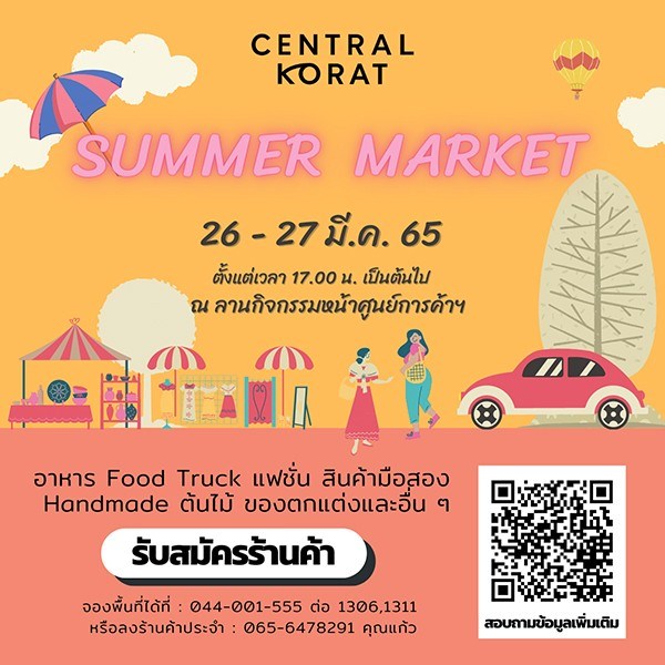 วันที่ 26 - 27 มีนาคม 2565 ณ ศูนย์การค้าเซ็นทรัล โคราช เปิดรับสมัครร้านค้า ฟรี! ชวนมาเปิดท้ายขายของ "SUMMER MARKET" ร้านอาหาร Food Truck แฟชั่น สินค้ามือสอง Handmade ต้นไม้ ของตกแต่งและอื่น ๆ พบกัน 26 - 27 มี.ค. นี้ ตั้งแต่เวลา 17.00 น. ณ ลานกิจกรรมหน้าศูนย์การค้า เซ็นทรัล โคราช
