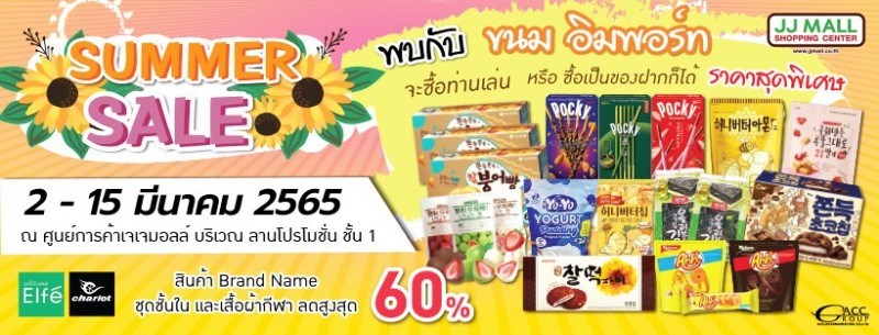SUMMER SALE พบกับขนมอิมพอร์ท จะซื้อทานเล่นหรือซื้อเป็นของฝากก็ได้ ราคาสุดพิเศษ และสินค้า Brand Name ชุดชั้นในแบรนด์ Elfe, ชุดกีฬา Chariot ลดสูงสุด 60% และอื่น ๆ อีกมากมากวันที่ 2 - 15 มีนาคม 2565 ณ ลานโปรโมชั่น ชั้น 1 เจเจมอลล์