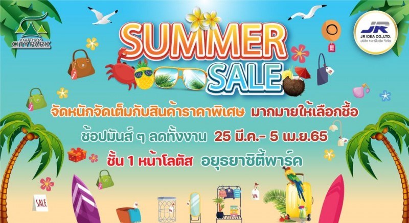 Summer Sale วันที่ 25 มีนาคม - 5 เมษายน 2565 ณ ศูนย์การค้าอยุธยาซิตี้พาร์ค "Summer Sale" ต้อนรับฤดูร้อน เอาใจขาช้อปไปกับสินค้าแฟชั่นหลากหลายสไตล์ ไม่ว่าจะเป็นเสื้อผ้าสุดชิค กระเป๋า รองเท้า ของตกแต่งของใช้ในบ้าน และอาหารคาว - หวาน อีกมากมาย ตั้งแต่วันที่ 25 มีนาคม - 5 เมษายน 2565 ณ ชั้น 1 หน้าโลตัส ศูนย์การค้าอยุธยาซิตี้พาร์ค