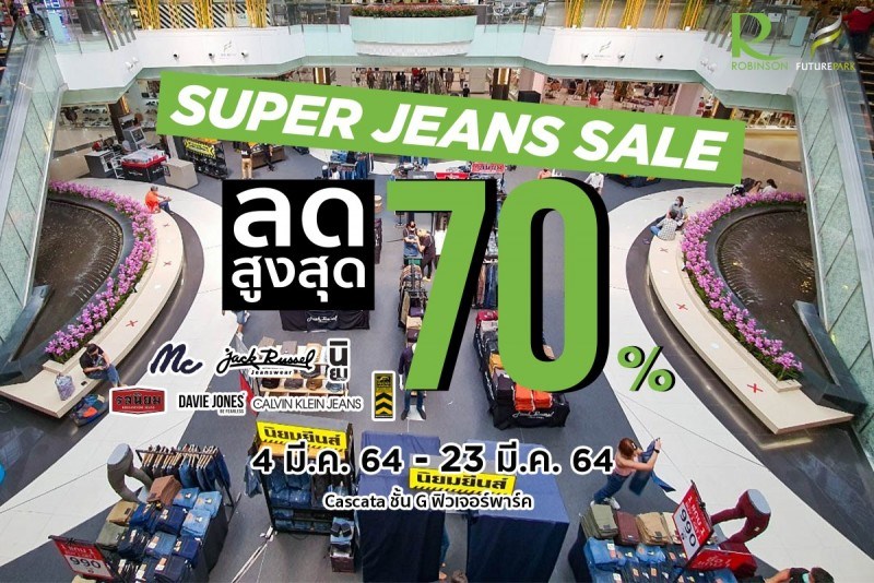 Super Jeans Sale วันที่ 4 - 23 มีนาคม 2564 ณ Cascata ชั้น G โซนโรบินสัน ฟิวเจอร์พาร์ค สวรรค์คนรักยีนส์! ใน Super Jeans Sale ยืนหนึ่งเรื่องแฟชั่น กี่ยุคก็ไม่เคยตก แมทช์ง่าย ก็คงไม่พ้นยีนส์ใช่มั้ยล่ะ! วันนี้โรบินสันเค้าจัดให้ กับมหกรรมยีนส์ที่ขนมาทั้งเทรนด์ใหม่ และโปรสบายกระเป๋า พร้อมให้ขาช้อปได้ลุยแล้ว !