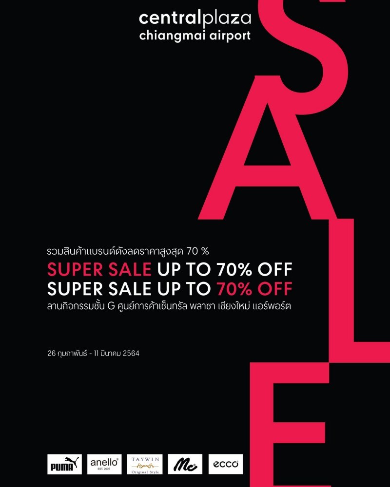 Super Sale วันที่ 26 กุมภาพันธ์ 2564 - 11 มีนาคม 2564 ณ ลานโปรโมชั่น ชั้น G ศูนย์การค้าเซ็นทรัลพลาซา เชียงใหม่ แอร์พอร์ต Super Sale เตรียมพบกับ สินค้าแบรนด์ดังลดราคาสูงสูด 70%
