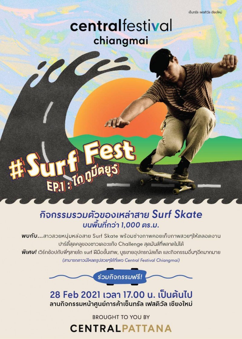 Surf Fest EP.1 : ไถ ทูมีตยูว์ วันที่ 28 กุมภาพันธ์ 2564 เวลา 16.00 น. เป็นต้นไป ณ ลานหน้าศูนย์การค้าเซ็นทรัล เฟสติวัล เชียงใหม่ ปรากฎการณ์ครั้งใหม่ สุดยิ่งใหญ่ ที่ชาว SKATE ต้องห้ามพลาด!!! ปักหมุดรอได้เลย....กับงานSurf Fest EP.1 : ไถ ทูมีตยูว์!! "การรวมตัวของสายไถ Surf ใหญ่สุดในเชียงใหม่" พบกับสาวสวยหนุ่มเท่ห์สาย Surf , ปาร์ตี้สุดคลูของชาวเดอะแก๊ง Challenge สุดมันส์ที่พลาดไม่ได้ พิเศษ! เวิร์กช้อปกับ Surf Skate CNX ทีมงานชั้นนำที่จะมาสอน Basic การเล่น Surf เบื้องต้น, ช้อปสินค้าจากร้านขายอุปกรณ์​สเก็ตชั้นนำในเชียงใหม่ Skate Republic, WHEELHOUSE41 พกความเท่ห์ ความคูลมา meeting กัน!!
