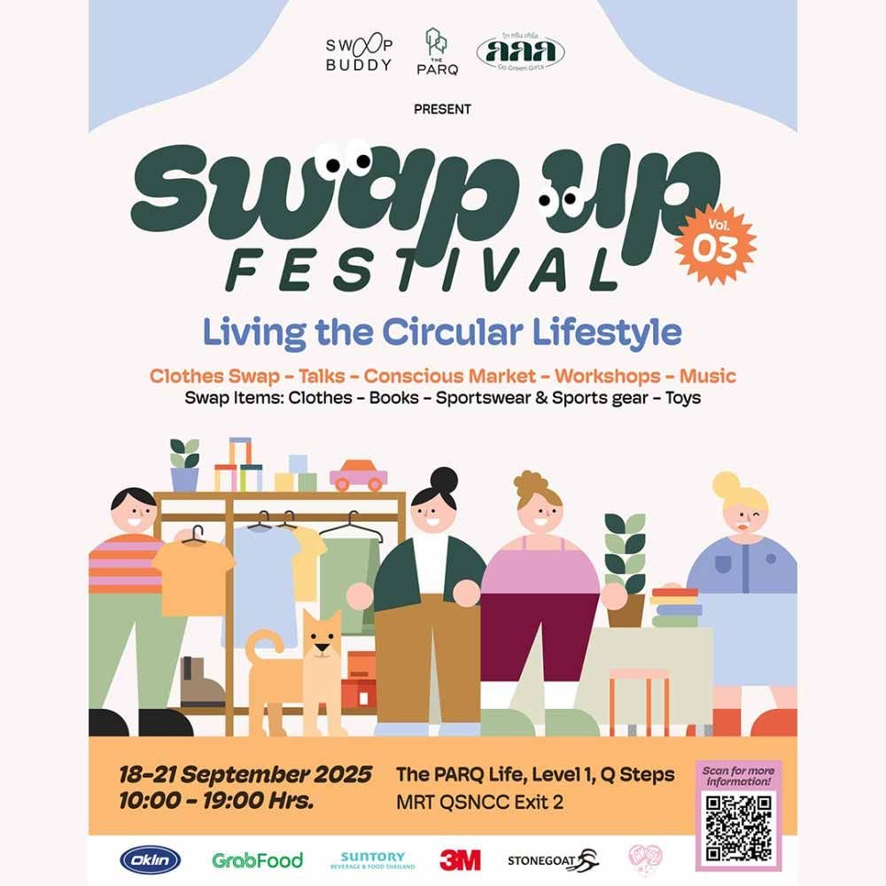 กลับมาอีกครั้งกับงาน 𝗦𝗪𝗔𝗣 𝗨𝗣 𝗙𝗲𝘀𝘁𝗶𝘃𝗮𝗹 𝗩𝗼𝗹.3 ในคอนเซปต์ “Living the Circular Lifestyle” อยากเชิญชวนทุกคนมาสนุกไปกับกิจกรรมที่ผสมผสานความเพลิดเพลินและความยั่งยืนไว้ในที่เดียว ไม่ว่าจะเป็นโซนแลกเปลี่ยนเสื้อผ้าและของใช้, pop-up สินค้ามือสอง, โซนซ่อมเสื้อผ้า, community learning, เวิร์กชอปสร้างสรรค์, art installation, ดนตรีสด และดีเจ