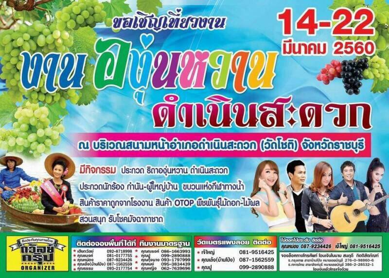 ชาวอำเภอดำเนินสะดวกเตรียมพร้อมจัดงานเทศกาลองุ่นหวาน และของดีดำเนินสะดวก ซึ่งปีนี้เป็นปีที่ 31 ในการจัดเทศกาลองุ่นหวาน ซึ่งทุกๆปีได้รับความสนใจจากประชาชนนักท่องเที่ยวอย่างมาก โดยในปีนี้ นายประยงค์ จันทร์เต็ง นายอำเภอดำเนินสะดวกกระซิบบอกว่า..... นักท่องเที่ยวที่รอเทศกาลองุ่นหวานปีนี้ไม่ควรพลาด เพราะปีนี้ชาวอำเภอดำเนินสะดวกจะจัดอย่างยิ่งใหญ่ไม่ให้แพ้ทุกปีที่ผ่านมา ภายใต้สโลแกน"หวานหนึ่งเดียวดำเนิน สวยเหลือเกินฝั่งคลอง ใครๆก็ต้องแลมองนวลน้องหนึ่งเดียวดำเนิน" โดยปีนี้ได้กำหนดการจัดงานตั้งแต่วันที่ 14 - 22 มีนาคม 2560 รวม 9 วัน 9 คืน ณ บริเวณวัดโชติทายการาม อ.ดำเนินสะดวก จ.ราชบุรี