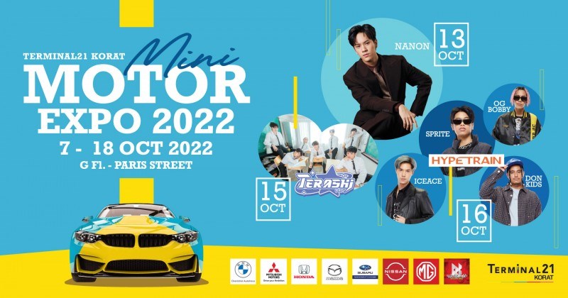 Terminal21 Korat Mini Motor Expo 2022 วันที่ 7 - 18 ตุลาคม 2565 ณ ศูนย์การค้าเทอร์มินอล21 โคราช 7-18 ต.ค.นี้ คนรักรถต้องมา! Terminal21 Korat Mini Motor Expo 2022 ที่มาพร้อม Promotion พิเศษจากค่ายรถยนต์ชั้นนำ อาทิ BMW MAZDA SUBARU HONDA NISSAN MITSUBICHI MG พร้อมความสนุกในช่วงวันหยุด 13 ต.ค. เวลา 17.00 น. พบกับ นนน กรภัทร์ 15 ต.ค. เวลา 17.00 น. พบกับ terashi 16 ต.ค. เวลา 17.00 น. พบกับ HYPERTRAIN, SPRITE, ICEACE, OGBOBBY, DONKIDS