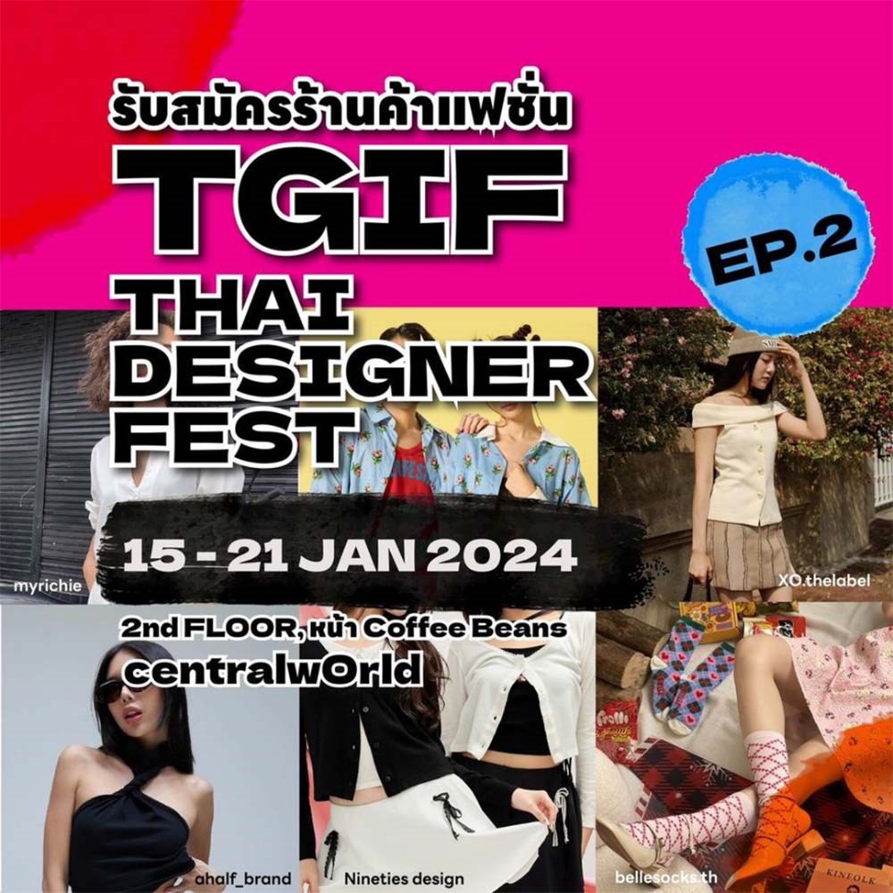 TGIF Thai Designer Fest EP.2 @CentralwOrld มหกรรมรวมแบรนด์ Thai Designer เจ้าดังในโลกออนไลน์ มารวมไว้ให้ Shopping ใจกลางห้างดัง centralwOrld อัพเดตแฟชั่นต้อนรับปีใหม่ วันที่ 15 - 21 มกราคม 2567 เวลา 10.00 - 22.00 น. ณ ลาน Eden ชั้น 2 @centralwOrld