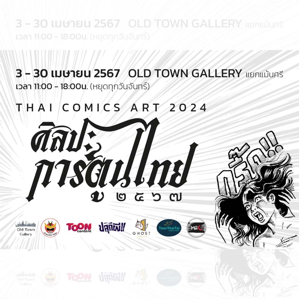 นิทรรศการ “THAI COMICS ART 2024” นิทรรศการศิลปะการ์ตูนไทย 2567 วันที่ 3 - 30 เมษายน 2567 เปิดงาน วันที่ 7 เมษายน 2567 ณ OLD TOWN GALLERY (แยกแม้นศรี) เวลา 11.00 - 18.00 น.