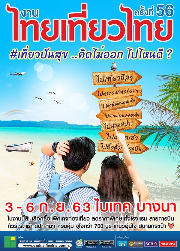 เตรียมพบกับมหกรรมท่องเที่ยวครั้งยิ่งใหญ่แห่งปี กับงานไทยเที่ยวไทยครั้งที่ 56 #เที่ยวปันสุข...คิดไม่ออก ไปไหนดี ? พร้อมโปรโมชั่นพิเศษให้ผู้รักการท่องเที่ยวได้เลือกซื้อและชมจุใจ ทั้งแพ็คเกจทัวร์ โรงแรม รีสอร์ สายการบิน สปา รถเช่า เรือท่องเที่ยว อุปกรณ์เดินทาง และท่องเที่ยวครบครันมากมาย จุใจกว่า 700 บูธ เที่ยวอุ่นใจ สบายกระเป๋า