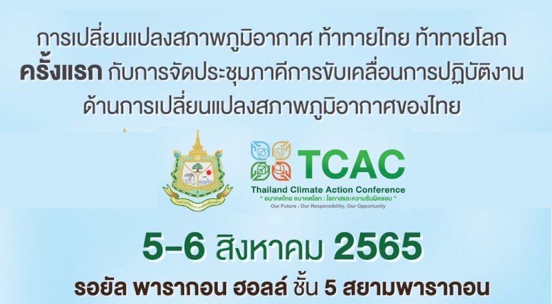 "ครั้งแรก" กับการจัดประชุมภาคีการขับเคลื่อนการปฏิบัติงานด้านการเปลี่ยนแปลงสภาพภูมิอากาศของไทย TCAC : Thailand Climate Action Conferance "อนาคตไทย อนาคตโลก : โอกาสและความรับผิดชอบ" พบกับ เวทีเสวนา การแลกเปลี่ยนประสบการณ์ ความรู้ ความเข้าใจ จากวิทยากรชั้นนำระดับประเทศ นิทรรศการ "อนาคตไทย อนาคตโลก" จากหน่วยงานภาครัฐและเอกชน วันที่ 5 - 6 สิงหาคม 2565 ณ รอยัล พารากอน ฮอลล์ ชั้น 5 สยามพารากอน โอกาสและความรับผิดชอบอยู่ในมือเราทุกคน มาร่วมกันเปลี่ยนแปลงสิ่งแวดล้อมของไทย ที่จะนำไปสู่การเปลี่ยนแปลงของโลก สภาพภูมิอากาศในปัจจุบันและอนาคต... "