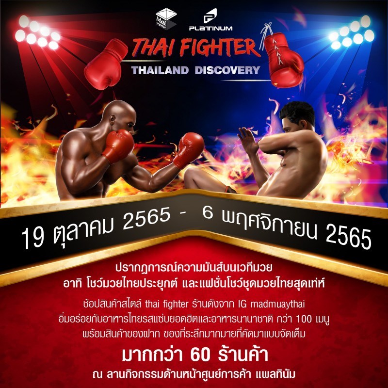 ช้อปเพลิน ชิมชิล ในงาน Thailand discovery ของกินก็ใช่ ของใช้ก็เฉียบ! สุดมันส์กับโชว์มวยไทยประยุกต์ จากนักแสดงเยาวชนรุ่นใหม่ แฟชั่นโชว์ชุดมวยไทยสุดเท่ห์บนเวทีมวย ช้อปกางเกงมวยไทยในสไตล์ thai fighter อินเทรนด์สุดๆจากร้านดัง ig. madmuaythai ของที่ระลึกและสินค้าของฝากที่คัดมาแบบจัดเต็ม มากกว่า 60 ร้านค้า อิ่มอร่อยกับอาหารไทยรสแซ่บยอดฮิต และอาหารนานาชาติ กว่า 100 เมนู ตั้งแต่วันที่ 19 ตุลาคม - 6 พฤศจิกายน 2565 ณ ลานกิจกรรมศูนย์การค้า แพลทินัม